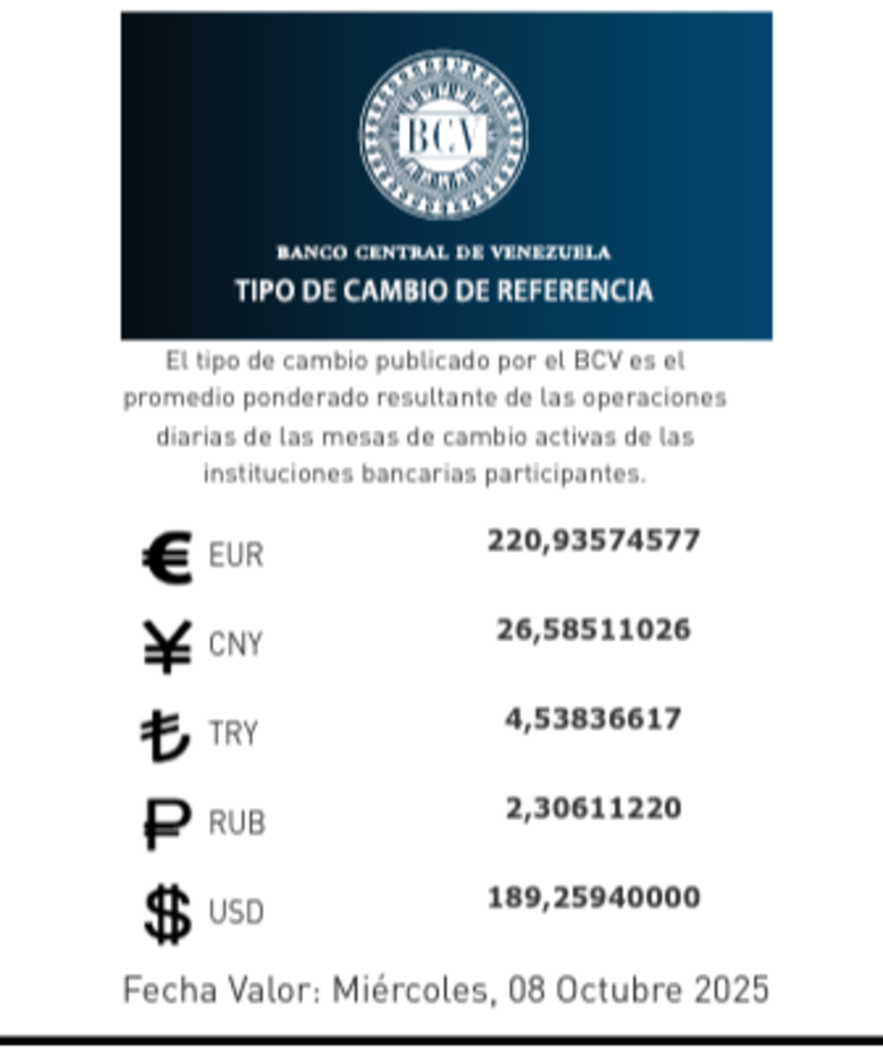 El dólar se cotiza en 189,25 bolívares y el euro se tasa en 220,93 bolívares.