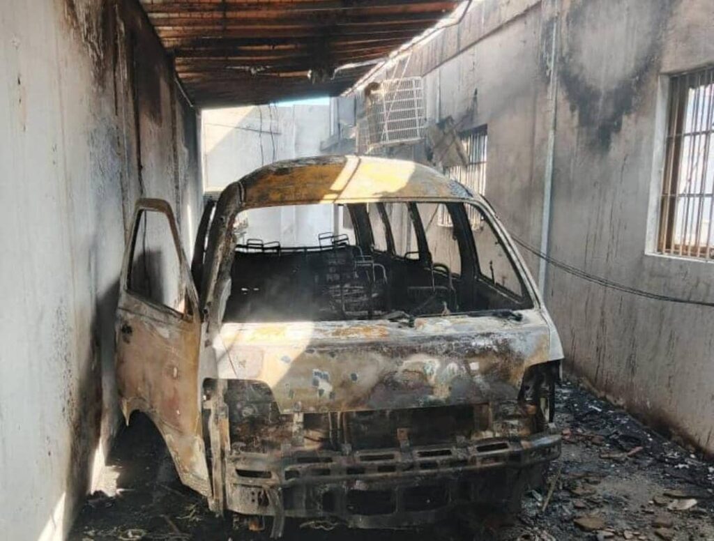 El incendio dejó el carro totalmente quemado y la estructura de la iglesia.