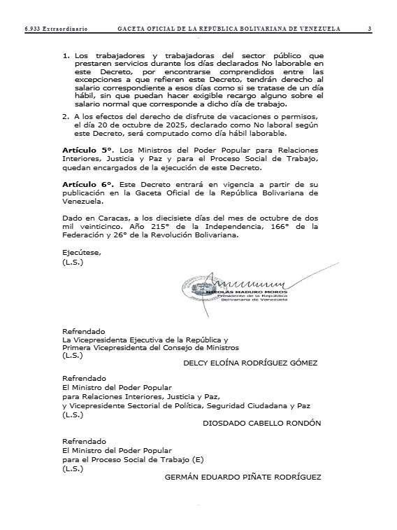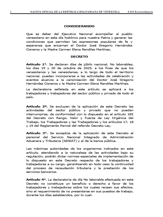 Por otro lado, el artículo 3 del decreto que declara los dos días de júbilo nacional exceptúa de su aplicación al personal del Servicio Nacional Integrado de Administración Aduanera y Tributaria (SENIAT) y al de la banca pública.