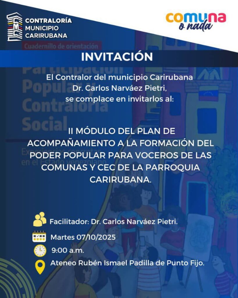 Comprometida con el fortalecimiento del Poder Popular y en cumplimiento de los lineamientos de la Contraloría General de la República Bolivariana de Venezuela, la Contraloría del municipio Carirubana iniciará el martes 7 de octubre a la II Fase del Plan de Formación para las Comunas.