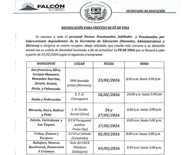 Del 25 de febrero al 3 de marzo del año en curso, la Secretaría de Educación del estado Falcón realizará una jornada de actualización de Fe de Vida. Para ello, el personal dependiente deberá dirigirse al centro receptor más cercano a su domicilio actual con la documentación requerida.
