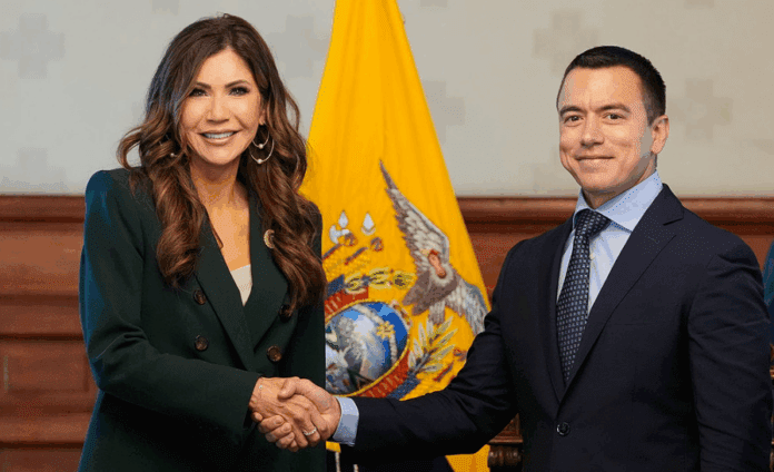 Pese a la creciente tensión política, la vocera del Gobierno ecuatoriano, Carolina Jaramillo, anunció que la secretaria de Seguridad Nacional de EE.UU., Kristi Noem, regresará en las próximas semanas a este país para determinar la ubicación de las «bases» que la funcionaria ya acordó con Noboa, aunque no aclaró si serán de tipo militar.