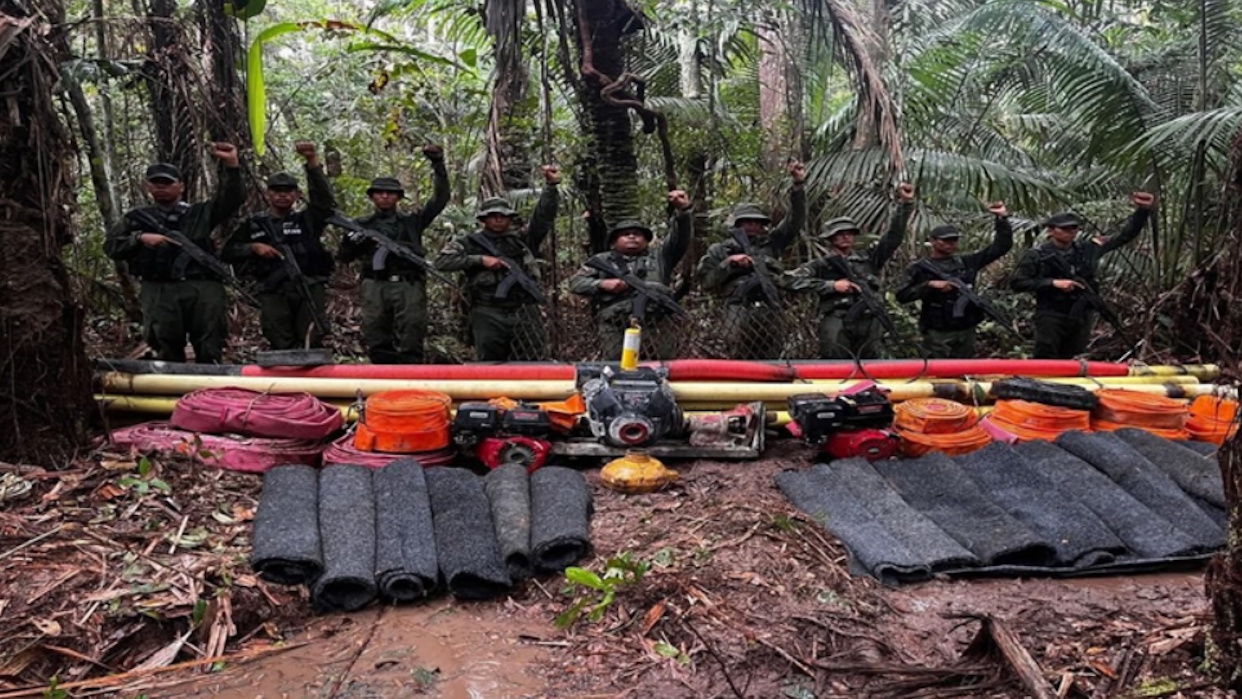 En el lugar, fueron incautados 40 tubos de PVC de 4”, dos motores mineros de 13 HP, un motor minero de 24 HP, un hidrojet minero, un caracol minero de 4”, dos caracoles mineros de 3”, 18 alfombras tipo tamiz, un cilindro de gas polipropileno, mil metros de manguera de alta presión de 4”, ocho metros de manguera tipo maraca de 4”, seis metros de manguera tipo maraca de 3”, dos rejillas metálicas y dos correas para motores mineros.