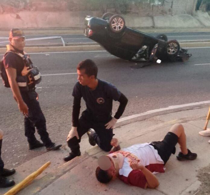 Dos personas lesionadas es el resultado del choque con un poste y posterior vuelco de un vehículo Fusión de color negro ocurrido hoy domingo 25 de enero.