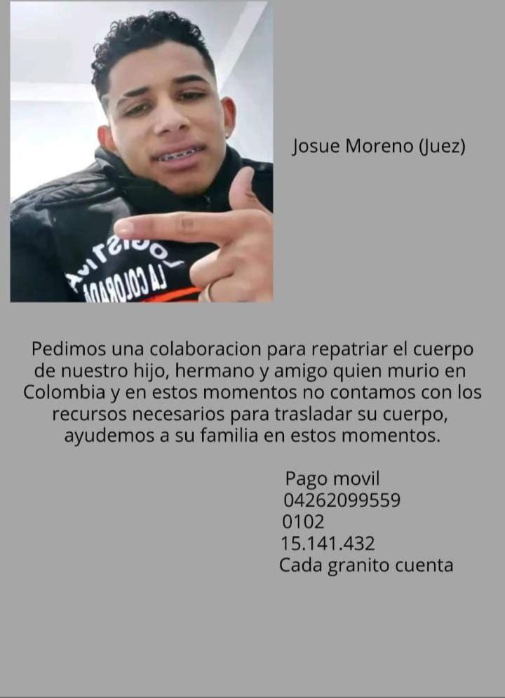Moreno era un joven trabajador y apreciado en su comunidad. Sus familiares, de escasos recursos económicos, se encuentran realizando actividades y recaudaciones para poder repatriar su cuerpo a Venezuela donde esperan darle cristiana sepultura.