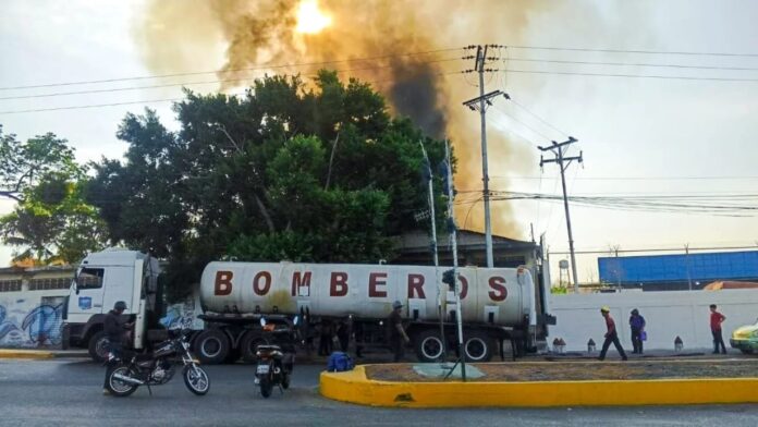 Funcionarios del Cuerpo de Bomberos del estado Aragua continúan las labores de extinción y refrescamiento tras un incendio registrado en una recicladora adyacente a la Cartonera Tapa-Tapa, en la carretera Maracay–Mariara.
