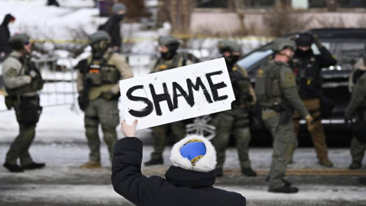 «¡Vergüenza! ¡Vergüenza! ¡Vergüenza!» e «¡ICE fuera de Minesota!», coreaba la multitud en protesta desde detrás de la cinta policial. Se estima que centenares de personas asistieron a la manifestación.