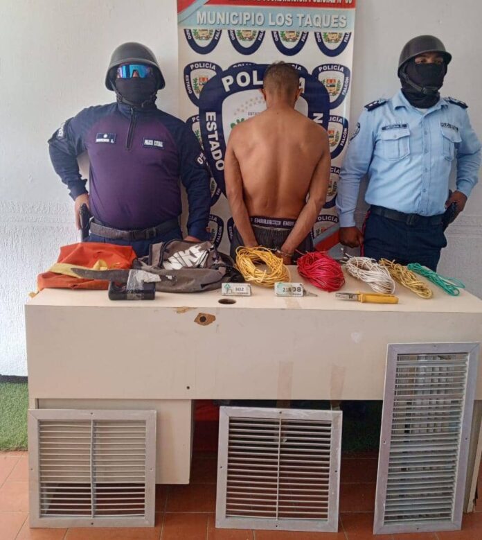 Se trata de un sujeto conocido en los bajos fondos como «El Ñoño» quien para el momento de la aprehensión hurtaba el cableado del Hotel Jardín, ubicado en la avenida principal de Judibana del municipio Los Taques.