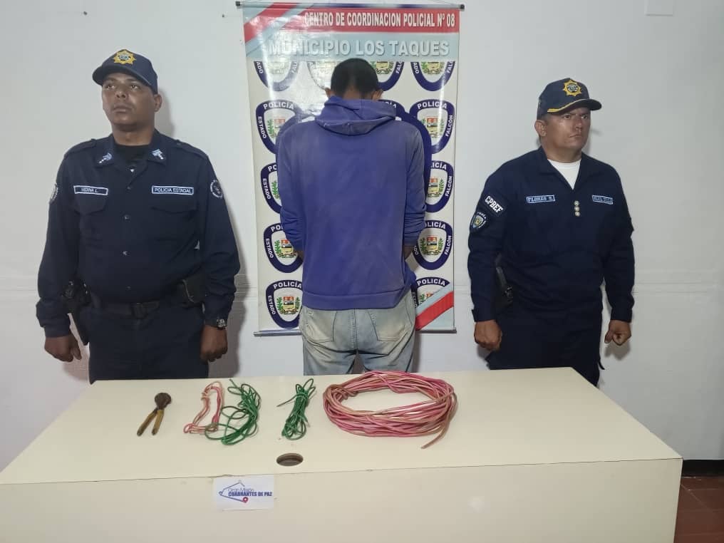 Un hombre de 31 años de edad fue detenido por funcionarios del Centro de Coordinación Policial (CCP) Número 7, Región Paraguaná, del Cuerpo de Policía Bolivariana del estado Falcón (Polifalcón), tras encontrarlo sustrayendo el cableado eléctrico que conduce corriente al alumbrado público en la Intercomunal Alí Primera, cerca de la pasarela del sector La Pastora, municipio Los Taques.