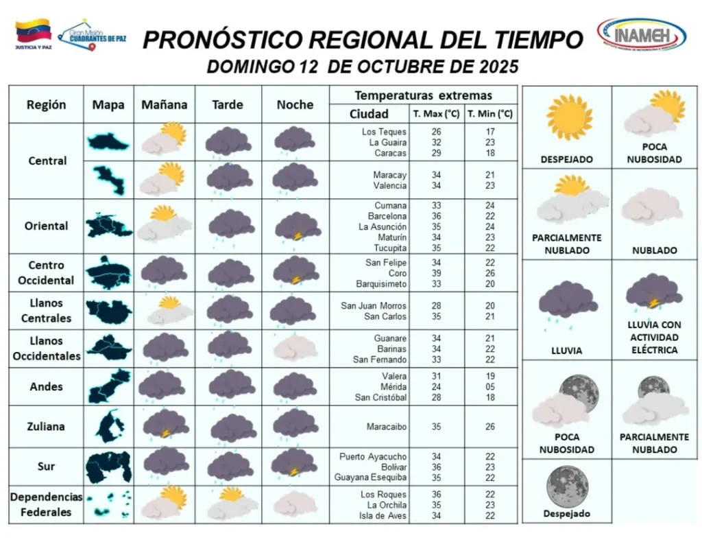 Este domingo 12 de octubre, el Instituto Nacional de Meteorología e Hidrología (Inameh) informó sobre la presencia de nubosidad acompañada de lluvias en Falcón y en distintas regiones del país. Igualmente, precipitaciones con descargas eléctricas.