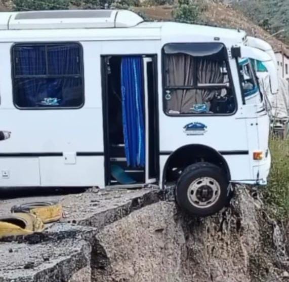 Una Encava de la línea Unión Táchira, viajando entre Barinas y Mérida quedó con las ruedas delanteras en el aire y casi cayó al río Trasandina, Curva La Única, Escagüey, Rangel, Mérida.