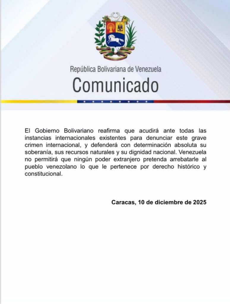 “Venezuela hace un llamado a todo el pueblo venezolano a mantenerse firme en defensa de la patria, y exhorta a la comunidad internacional a rechazar esta agresión vandálica, ilegal y sin precedentes que se pretende normalizar como herramienta de presión y saqueo”, destaca el comunicado.