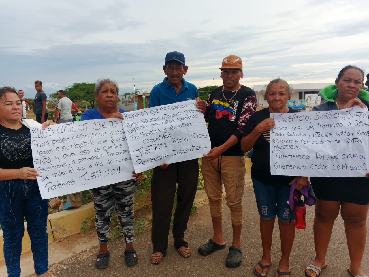 Con pancartas los residentes de Las Cumaraguas piden la liberación de los hermanos quienes fueron buscados en sus hogares por funcionarios de la División de la Investigación Penal base @dip_puntofijo del estado Falcón.